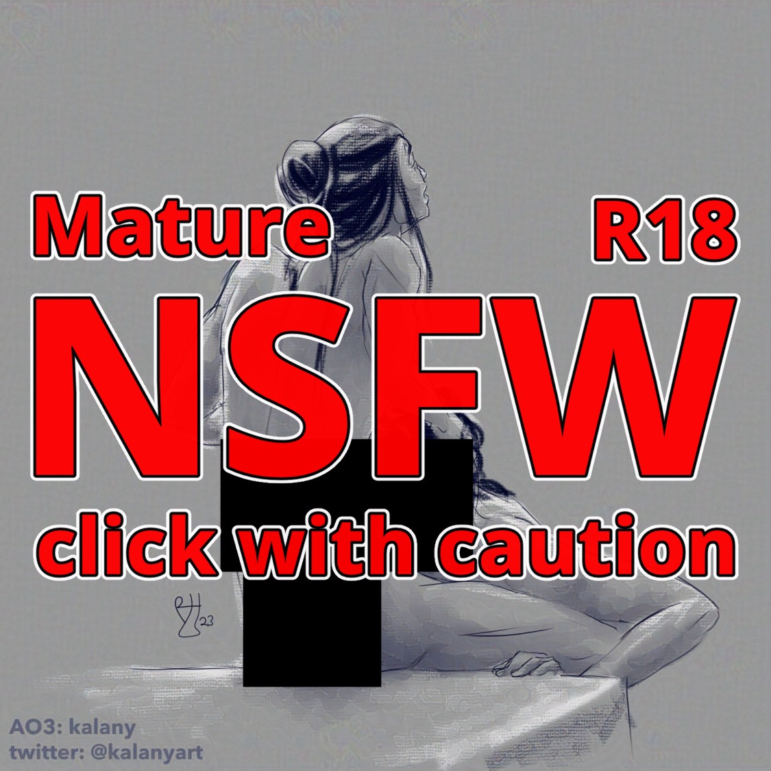 One thin naked man with his hair up, Shen Qingqiu, sits on the edge of a bed or table. Another man, Luo Binghe, is on the floor between Shen Qingqiu's legs, one hand on the edge of the table or bed next to Shen Qingqiu, mouth clearly engaged with Shen Qingqiu's cock. Shen Qingqiu's head is thrown back, looking like he's in the middle of an orgasm. No genitalia can be seen. The piece is in a sketchy style in creams and blues.