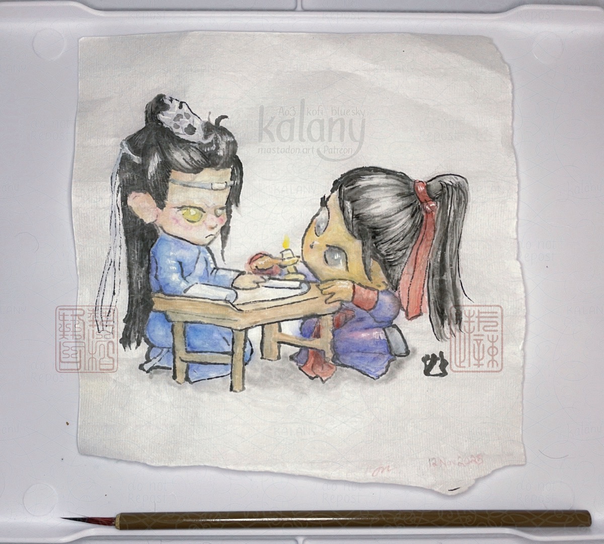 A physical watercolor painting of two chibi figures on a small, uneven piece of shangxuan paper, in a sort of hybrid Western and gongbi style. It shows chibi versions of Lan Wangji and Wei Wuxian; Lan Wangji is trying to work while Wei Wuxian messes with the things on his desk, staring intently at him.