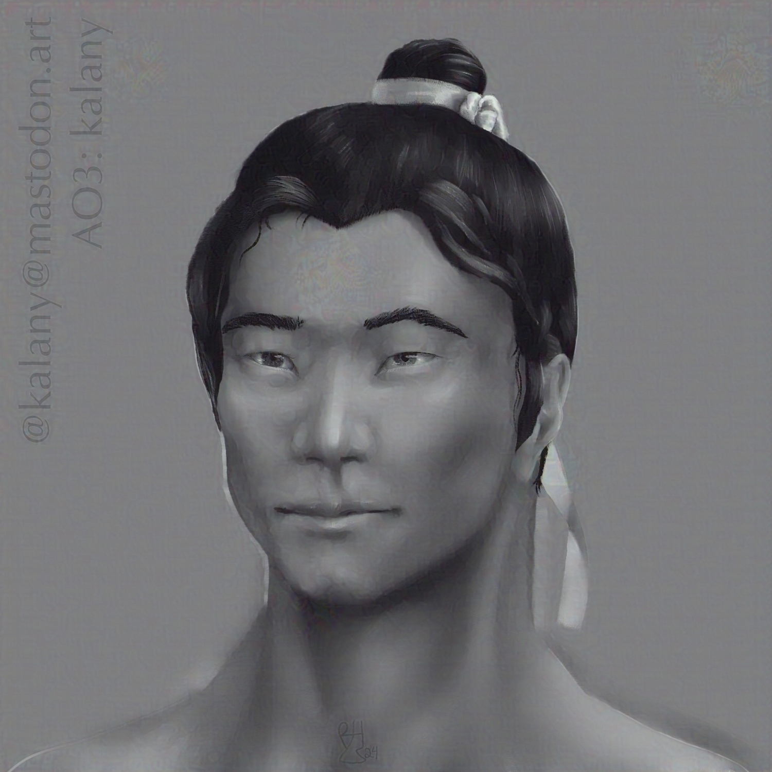 A bust of a Chinese man with his hair up in a bun. He's smiling a little and looks amused, with kindly eyes. The piece is done in a black-and-white digital art style that imitates a pencil drawing.