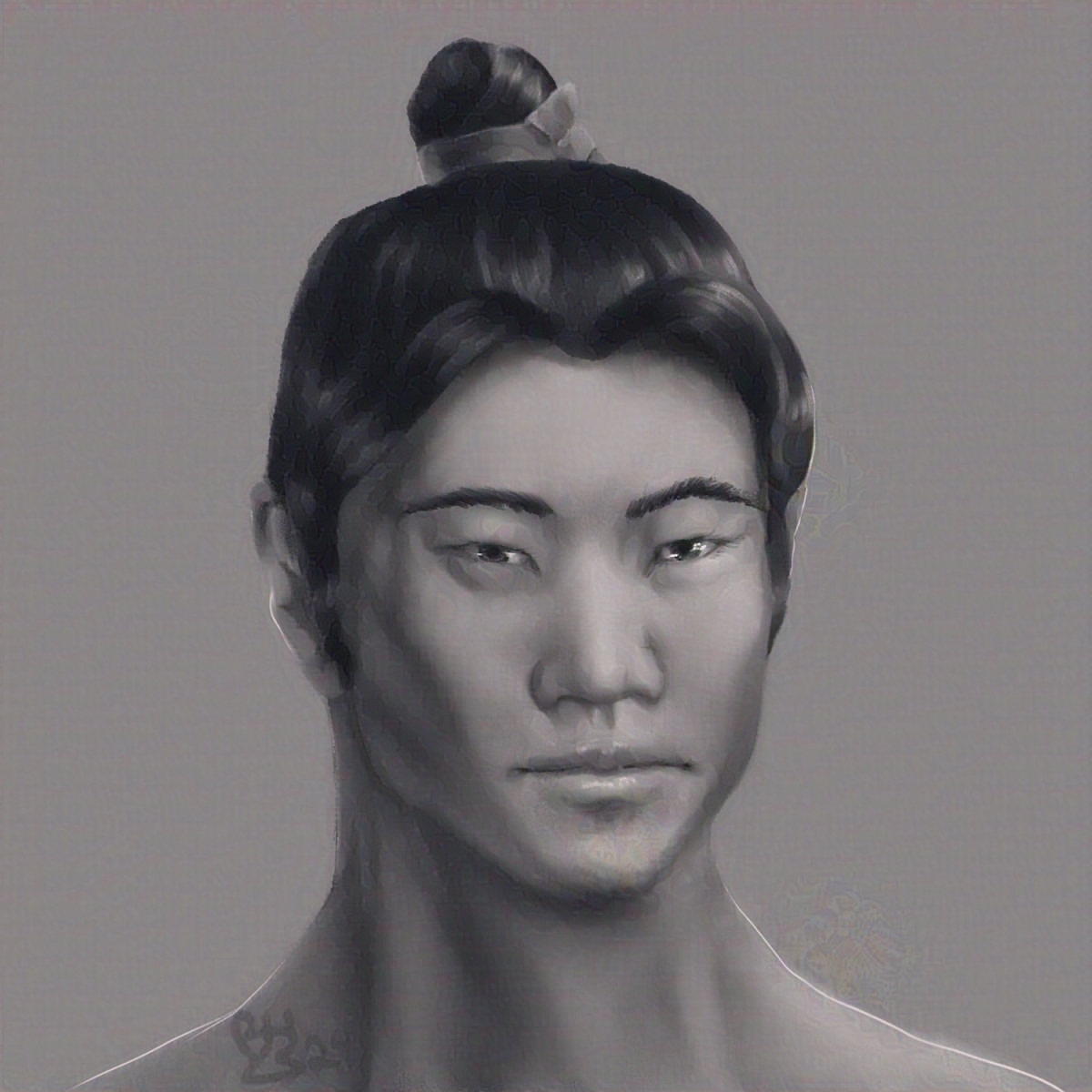 A bust of a Chinese man with his hair up in a bun. He's smiling ever so slightly and looks like he has a good sense of humor. The piece is done in a black-and-white style of digital art that looks a lot like pencil shading.